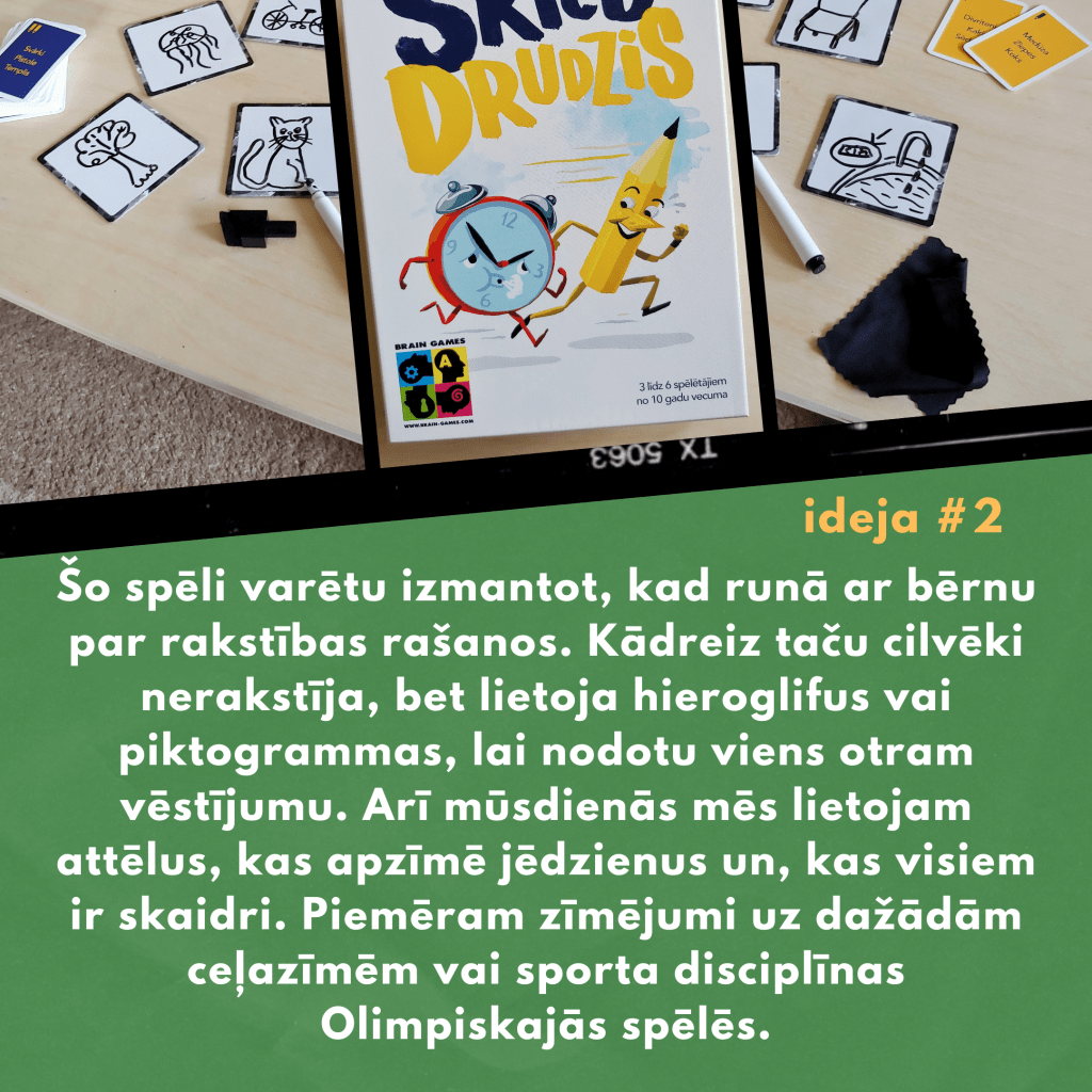 Šī spēle mūsu bērniem trenē spēju ātri pārvērst abstrakciju konkrētā formā un darīt to maksimāli “skaidri”. Tā māca strādāt paaugstināta stresa apstākļos, jo laiks ir ierobežots, un saglabāt mieru arī situācijā, kad liekas “ūdens smeļas mutē”. Spēle māca novērst zīmējumos trūkumus, tos izlabot. Un, protams, arī šī spēle dod iespēju mācīties pieņemt zaudējumu, kas nebūt nav viegli.