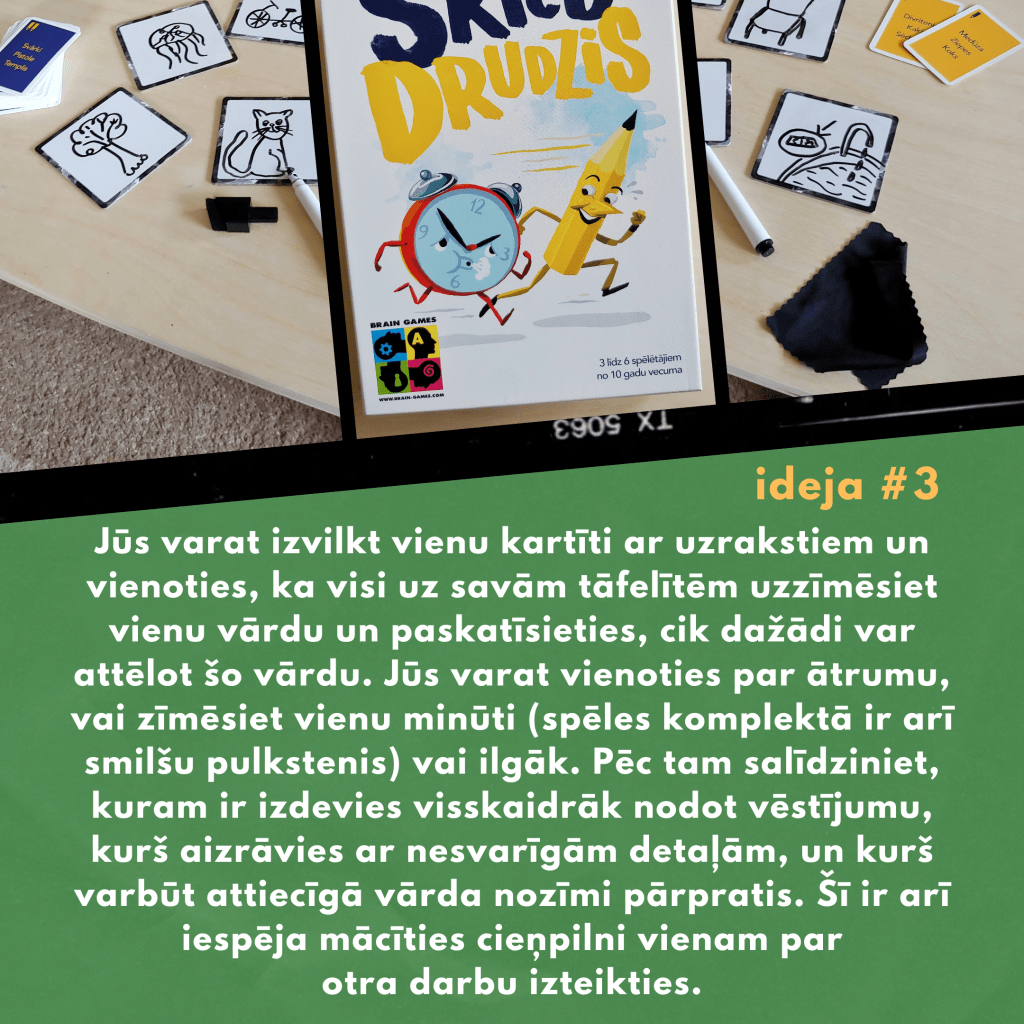Ir reizes, kad mēs mēdzam pārāk strikti pie galda spēļu noteikumiem neturēties. Arī šajā spēlē, vismaz iesākumā, mums galvenais bija baudīt zīmēšanas prieku un mēģināt uzminēt, ko otrs ir uzzīmējis nevis skaitīt punktus.