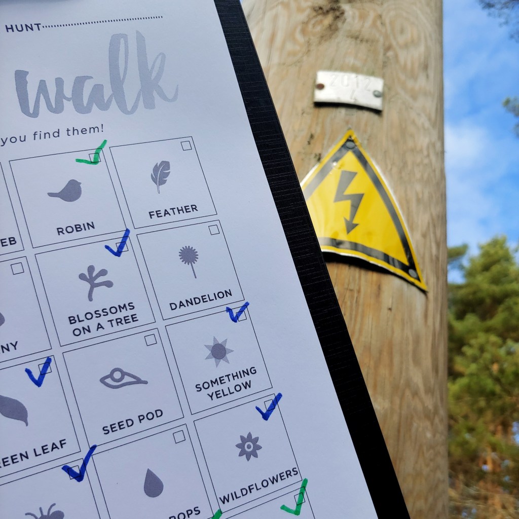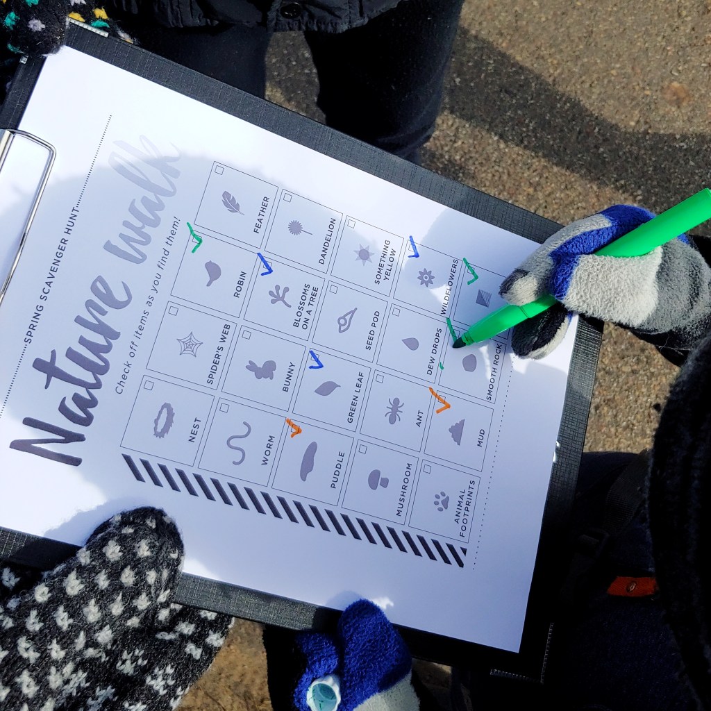 🔸 Izdrukāju “dārgumus“, kuri dabā jāatrod (google ierakstīju “spring scavenger hunt”).