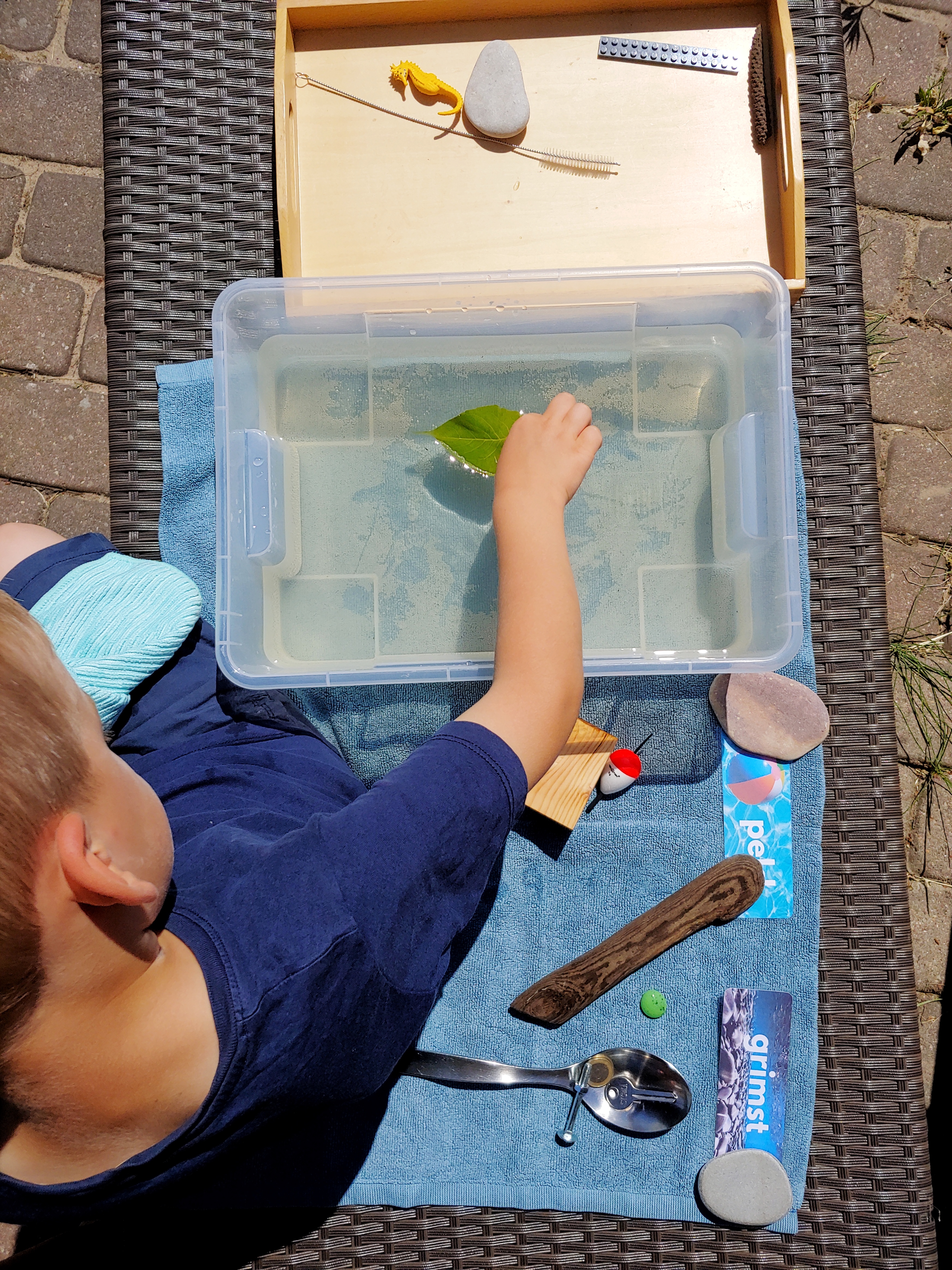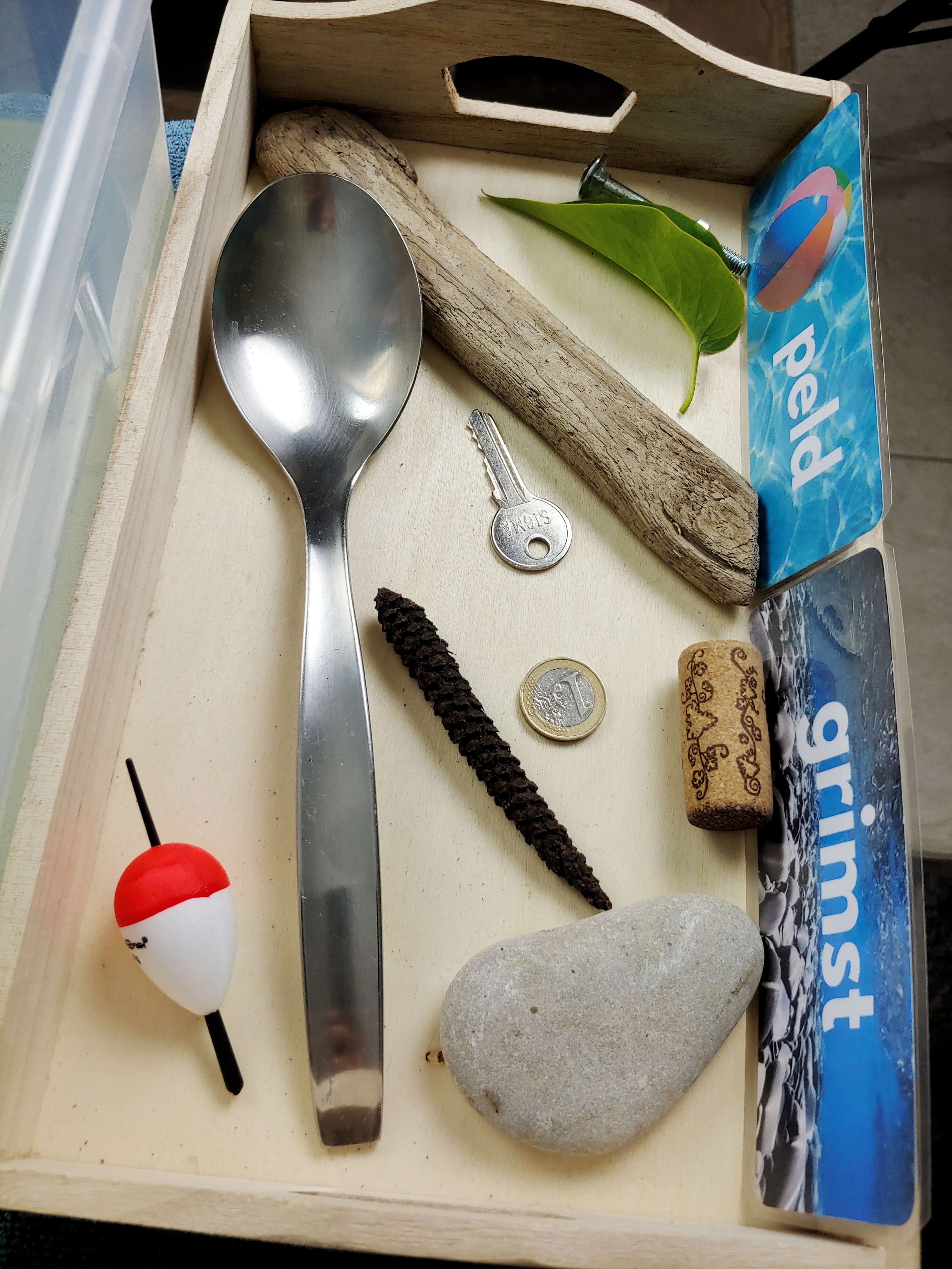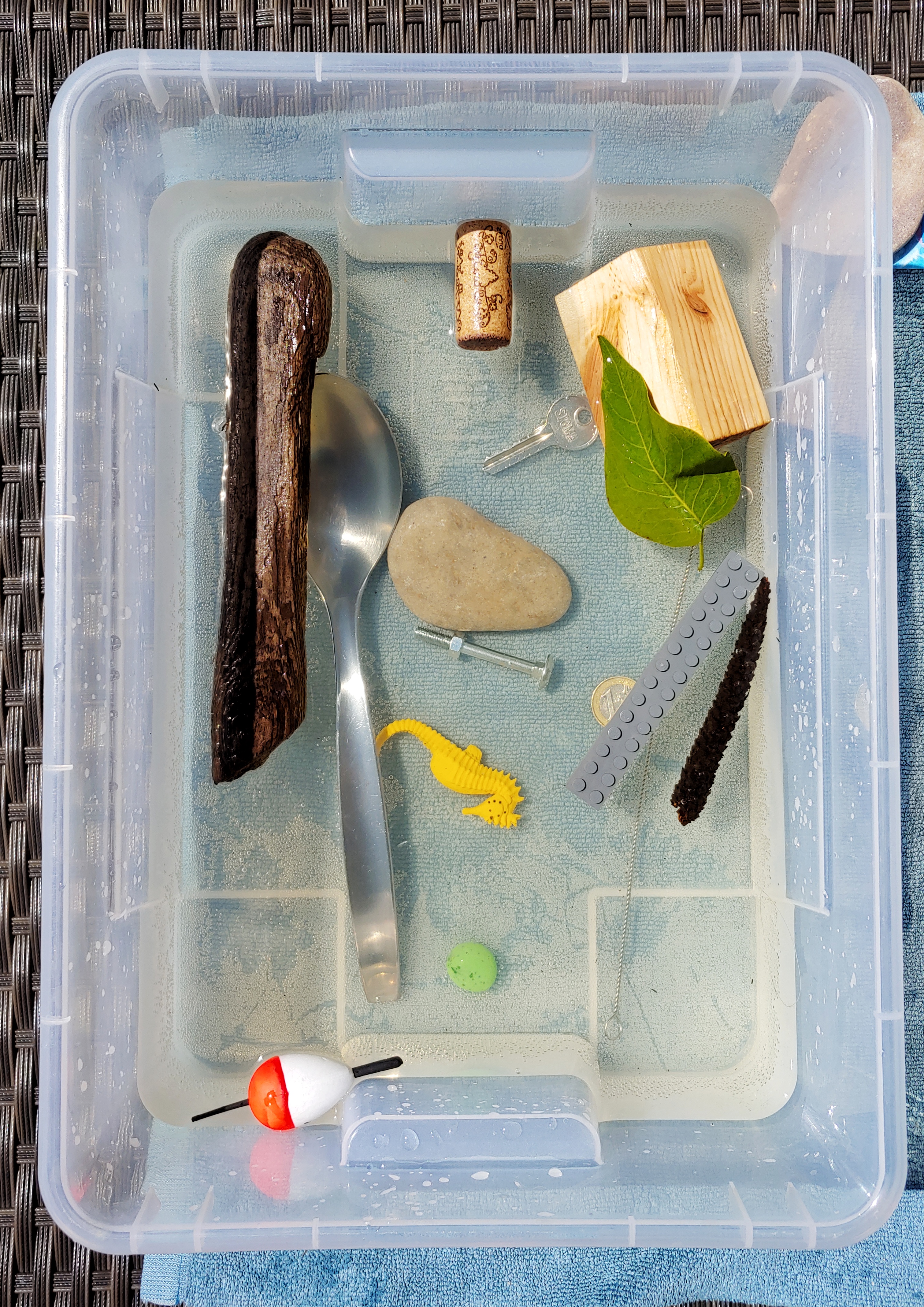 * Mēs “peldinājām” šādus priekšmetus – korķi, koka klucīti, atslēgu, akmeni, karoti, skrūvi, monētu, lego klucīti, čiekuru, koka gabaliņu, koka lapu, plastmasa rotaļlietu, stikla akmentiņu, pludiņu un birstīti, ar kuru tīrām silikona salmiņus.