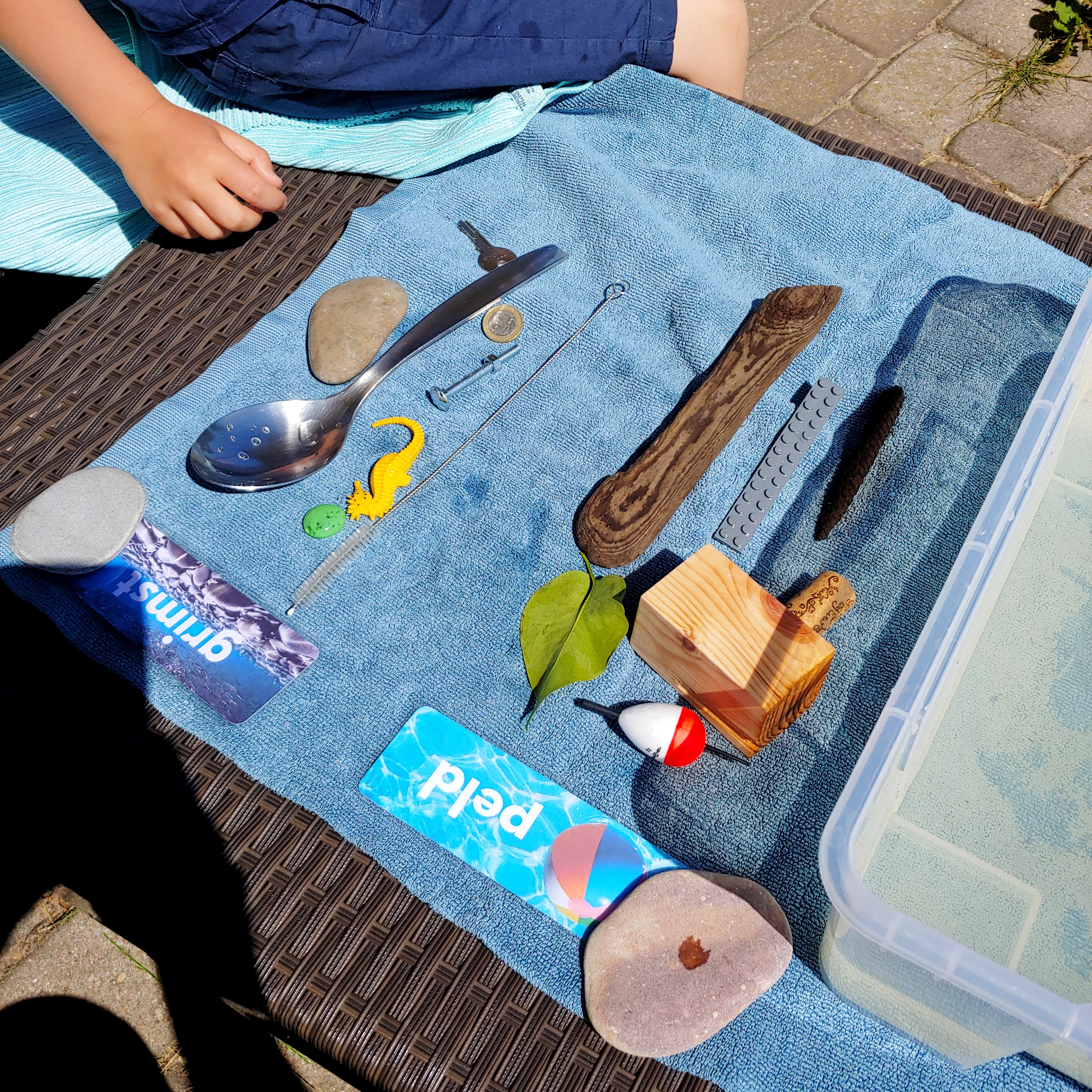 5️⃣ Pēc novērojuma, izņemiet priekšmetu no ūdens, nosusiniet dvielīti un noliekat pie attiecīgā uzraksta – vai nu “peld” vai “grimst”.