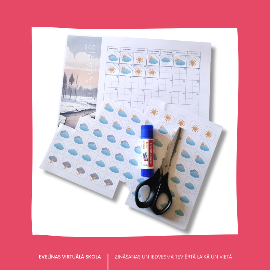 Tas ir kalendārs, kuru Tu pats vari izdrukāt un kurā ir paredzēts noteiktu laika posmu ik dienas atzīmēt laikapstākļus – gaisa temperatūru, vēja virzienu, mākoņu daudzumu un nokrišņu veidu. Pirmskolas vecuma bērniem šo uzdevumu ir iespējams veikt vienkāršotā formā.